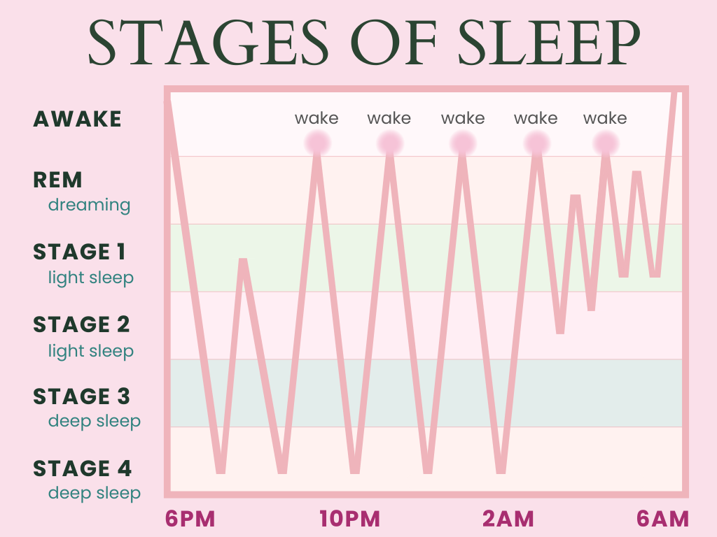 Approximate example of how we move through the 5 sleep stages throughout the night.